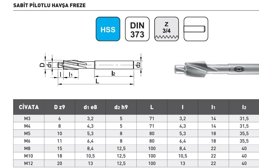 M8 GWG Sabit Pilotlu Havşa Freze DIN373 HSS