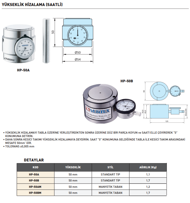 VERTEX HP-50BM Manyetik Yükseklik Hizalama Saatli 50mm