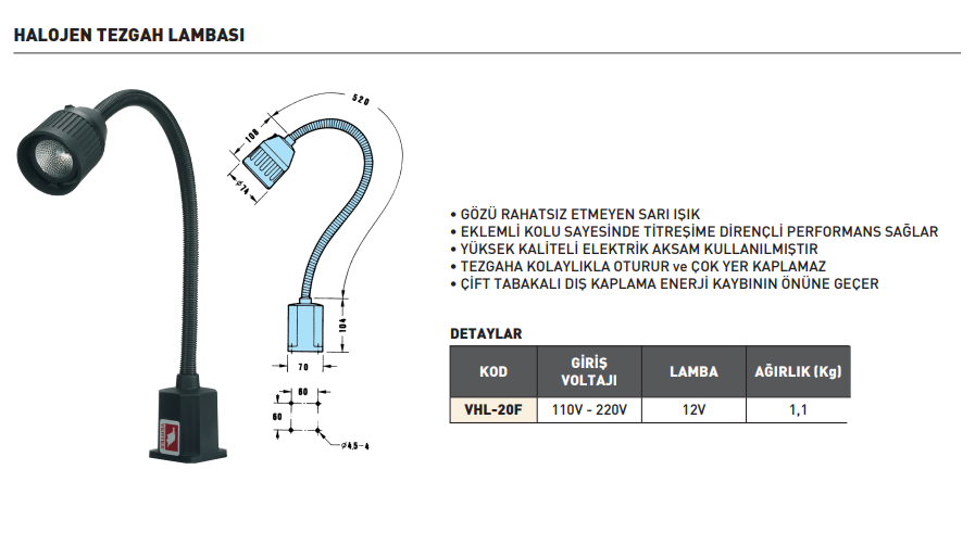 VERTEX VHL-20F Manyetik Tabanlı Halojen Tezgah Lambası 12 Volt